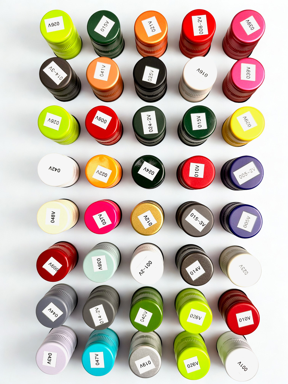 We have standard colours available for screwcaps: Black, White, Silver, Gold, Yellow, Orange, Red, Green, Blue, Grey (see colours on the picture right).